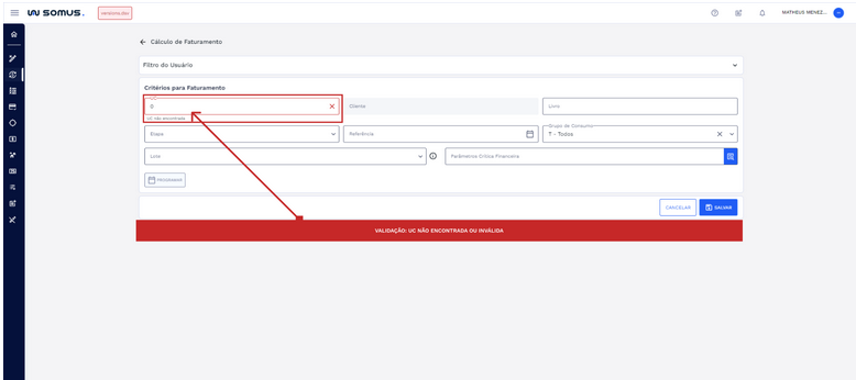 - O sistema verifica se a UC está em situação de espelho e se é apta para faturamento. Em seguida, válida a UC: caso seja inválida, um erro de "UC inválida" será exibido.