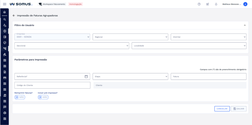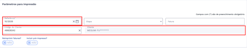 Se for necessário reimprimir ou baixar novamente uma fatura, utilize os campos de parâmetros com os dados desejados e habilite o switch de Reimpressão para gerar a fatura novamente.