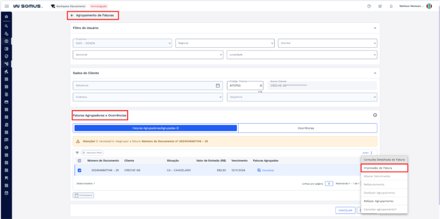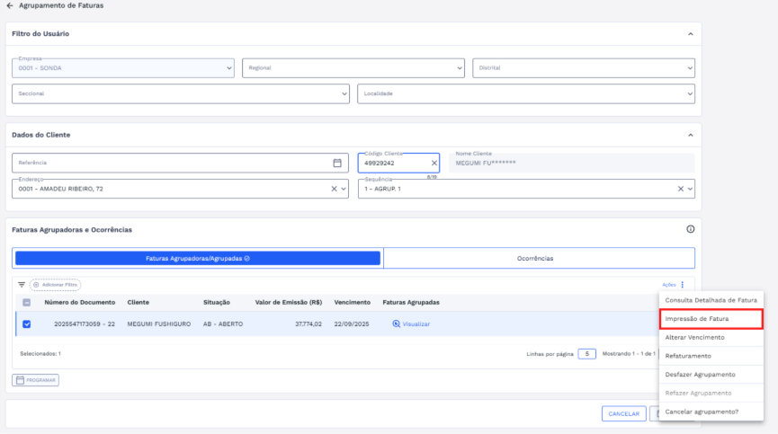 Na tabela, selecione a fatura agrupadora desejada, clique no botão de Ações e, em seguida, escolha a opção “Impressão de Faturas” na lista suspensa.