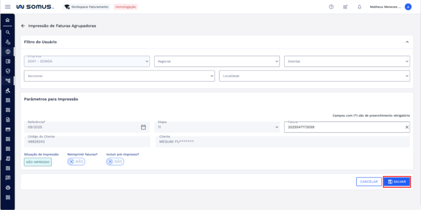 Ao clicar nessa opção, você será direcionado para a tela de Impressão de Faturas, já com os dados carregados. Para concluir, clique em SALVAR e prossiga com a impressão.