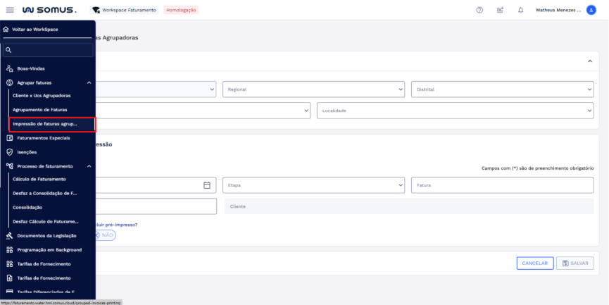 Caminho 1: Acesse o Workspace “Faturamento”, clique em ENTRAR. No menu, clique no item de menu “Impressão de Faturas Agrupadoras”.