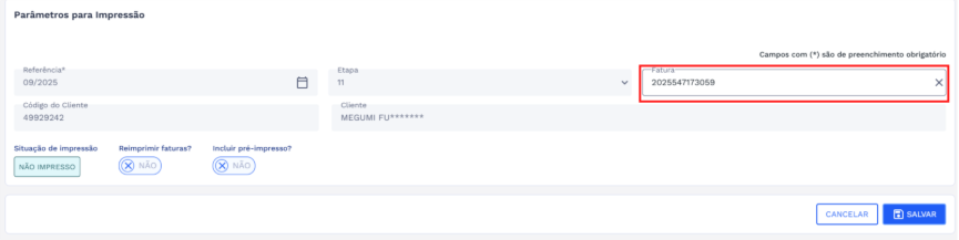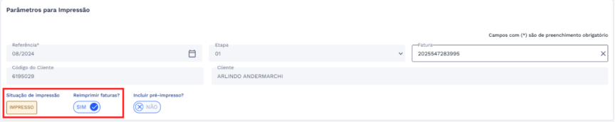 IMPORTANTE: No primeiro pedido de impressão, não é necessário habilitar o switch de Reimpressão. No entanto, se a situação da fatura estiver como “IMPRESSO”, será necessário habilitá-lo para prosseguir.