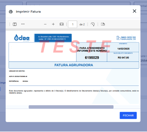 Após preencher os campos, clique em SALVAR. O sistema irá carregar as faturas correspondentes para impressão. Quando o carregamento for concluído, a fatura será exibida em uma modal, permitindo visualizar, imprimir ou fazer o download do arquivo.