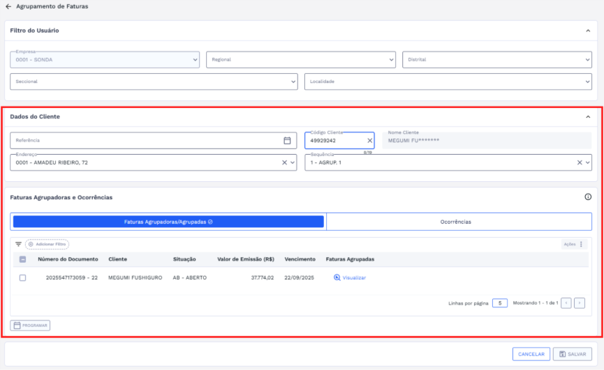Para mais informações sobre o Agrupamento de Faturas, acesse a documentação disponível na seção 10. DOCUMENTOS RELACIONADOS.