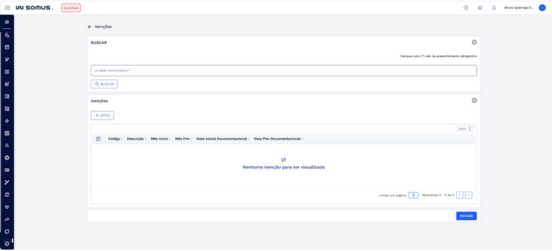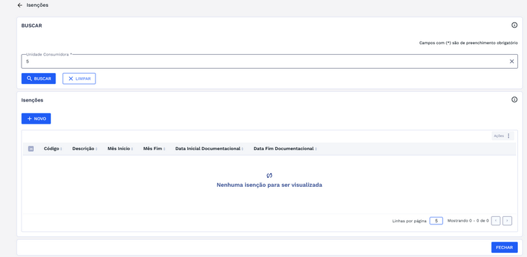 Caso não existam registros, a aplicação informará que não há isenções associadas e o botão “NOVO” é habilitado para inclusão de isenções para UC pesquisada.