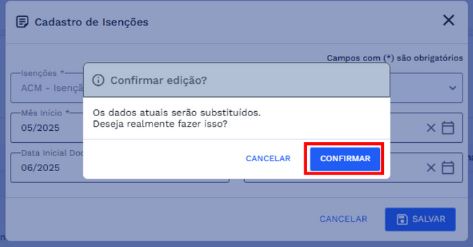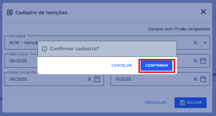 Em seguida, será exibida uma caixa de diálogo de confirmação. Para concluir o cadastro, selecione a opção “CONFIRMAR”. Caso opte por não prosseguir, clique em “CANCELAR” para retornar à tela de isenções sem efetivar a operação, confira na imagem abaixo: