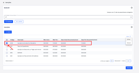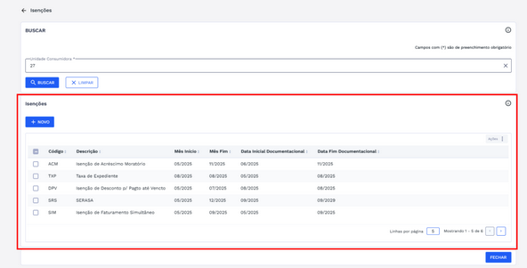 Ao clicar no botão “Fechar” da caixa de diálogo de sucesso, o sistema retornará automaticamente para a tela de isenções, agora com a nova isenção inserida na lista da Unidade Consumidora (UC) vinculada.