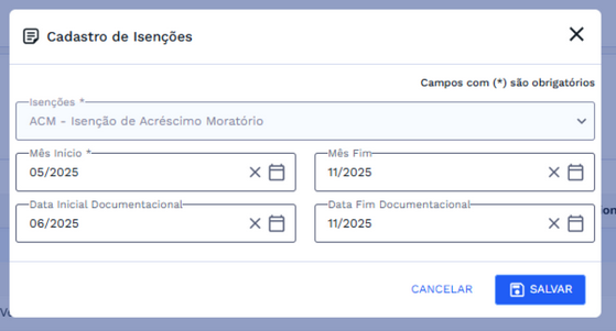 - Data Inicial Documentacional: data a partir da qual a documentação (contrato de isenção) é válida;