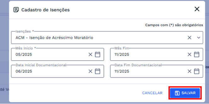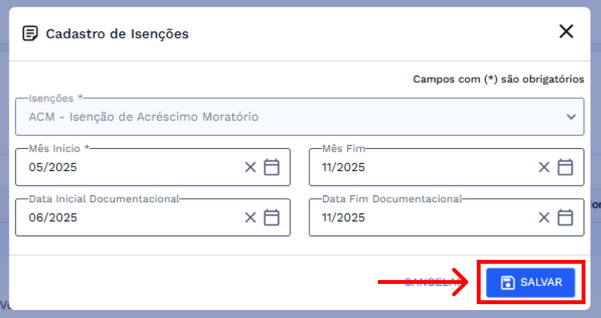 Após concluir as modificações, confirme as mudanças clicando no botão "Salvar" para atualizar o cadastro de isenções.
