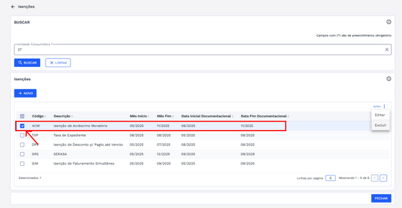 Para excluir o cadastro de isenções, primeiro realize a busca pela UC, conforme descrito na seção BUSCAR ISENÇÕES. Após localizar o registro desejado, selecione-o. Em seguida, o botão de “Ações”, localizado à direita do registro, será habilitado. Clique nesse botão e selecione a opção "Excluir" na lista exibida, conforme ilustrado na imagem abaixo: