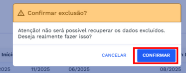 O sistema apresentará uma caixa de diálogo com a mensagem "Confirmar exclusão?", alertando que não será possível recuperar os dados excluídos e perguntando se deseja realmente prosseguir. Para confirmar a exclusão, clique em "Confirmar"; caso prefira cancelar a ação, clique em "CANCELAR". Confira o exemplo na imagem abaixo:
