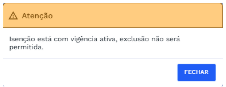 Caso a isenção esteja com vigência ativa, será exibida uma mensagem de alerta impedindo a ação, conforme demonstrado abaixo: