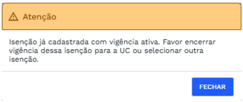 Ao realizar o cadastro de uma nova isenção, o sistema executa uma validação automática para verificar se já existe uma isenção cadastrada com vigência ativa para a mesma UC.