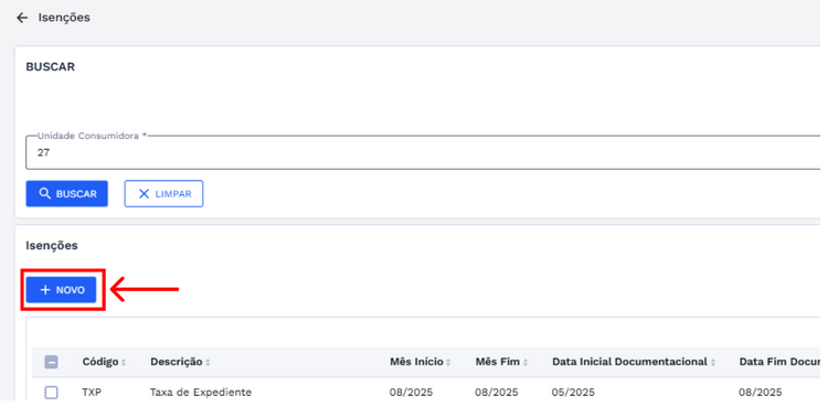 Com a UC localizada, o usuário poderá cadastrar uma nova isenção clicando no botão "+ NOVO" do lado esquerdo da tela.