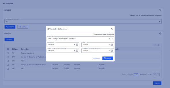 Após a busca, se houver isenções já cadastradas para a UC informada, elas serão carregadas e exibidas automaticamente na listagem.