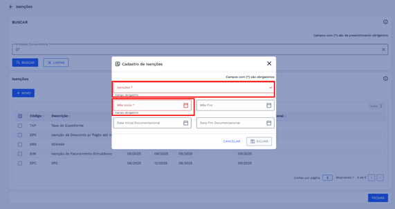 - Isenção: seleção do tipo de isenção aplicável (campo obrigatório). Atenção! Ao selecionar a Isenção, o sistema valida automaticamente se já existe uma isenção com vigência ativa para a UC. Caso exista, o cadastro não poderá prosseguir. Para mais detalhes, consulte a seção VALIDAÇÕES DO SISTEMA.