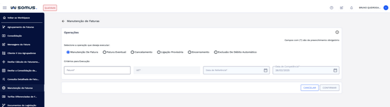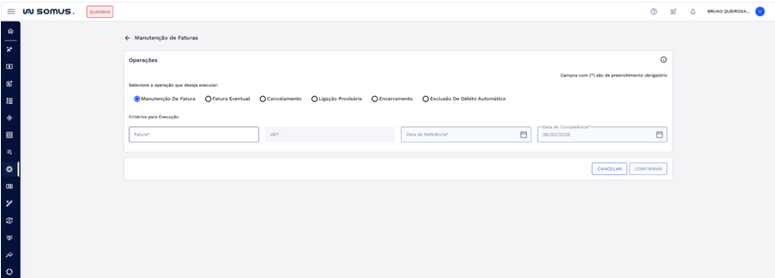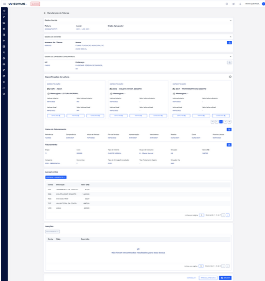 A aplicação de Manutenção de Faturas permite a gestão e retificação de registros de faturamento, viabilizando a correção de inconsistências, ajustes manuais e administração de operações relacionadas ao ciclo de faturamento. O sistema possibilita a execução de cancelamentos, encerramentos e emissão de faturas eventuais, além de permitir a remoção de faturas do débito automático em conta corrente (DAC) e o gerenciamento de ligações provisórias.