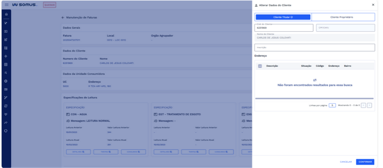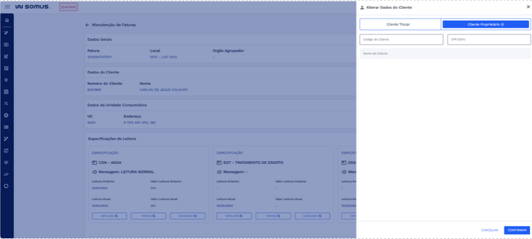 - Confirmar: O sistema realizará o cálculo da fatura com base nos novos dados fornecidos. Uma vez concluído o processamento, você será redirecionado para a tela de manutenção, onde os dados do cliente estarão atualizados de acordo com as alterações realizadas.