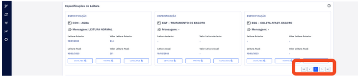 - Especificações de Leitura: Exibe detalhes de leitura, mensagens e botões de ação para visualizar tarifas, detalhes e consumos.