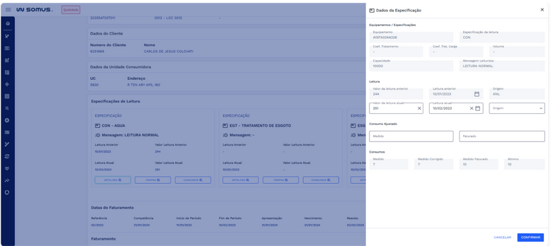 - Edição de dados: Para determinadas especificações, você poderá editar os dados diretamente ao acessar os detalhes. Esta funcionalidade está disponível em cenários como CON - Água, onde os dados de especificação podem ser modificados. Os campos que podem ser editados incluem valor da leitura atual, leitura atual e origem, além dos consumos ajustados, como medido e faturado. Esses dados podem ser alterados diretamente na janela de edição, proporcionando flexibilidade para atualizar as informações conforme necessário. Após realizar as alterações desejadas, você pode confirmar as modificações para aplicar as mudanças ou optar por cancelar e retornar à tela anterior.