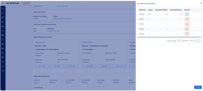 - Histórico de consumo: É possível consultar o histórico de consumo relacionado à especificação, visualizando as leituras anteriores e atuais de forma detalhada. Ao clicar no botão Consumo, será exibida uma janela com os dados de referência, origem, quantidade medida, quantidade faturada e situação. Para retornar à tela anterior, basta clicar no botão Fechar.