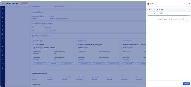 - Tarifas: Ao clicar no botão Tarifas, será exibida uma janela contendo os dados relacionados ao consumo e ao valor da tarifa associada à especificação selecionada. Após revisar as informações na janela, basta clicar no botão fechar para retornar à tela anterior.