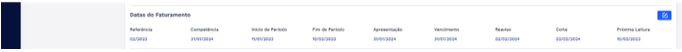 - Datas do Faturamento: Nesta seção, você pode consultar as datas relacionadas ao faturamento, como referência, competência, início do período, fim do período, apresentação, vencimento, reaviso, corte e próxima leitura.