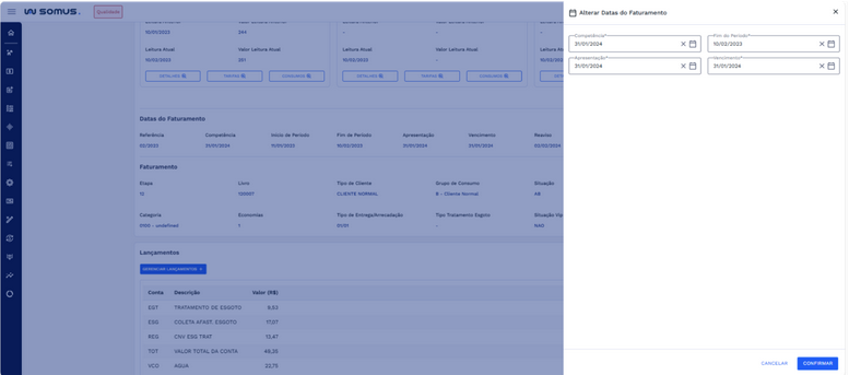 Confirmar: O sistema realizará o cálculo da fatura com base nos novos dados fornecidos. Uma vez concluído o processamento, você será redirecionado para a tela de manutenção, onde as datas de faturamento estarão atualizadas de acordo com as alterações realizadas.