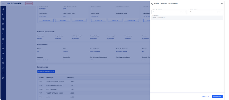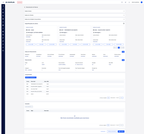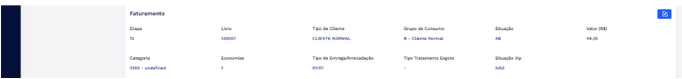 Faturamento: Na seção de Faturamento, você pode visualizar informações relacionadas ao processo de faturamento, como a etapa, o livro ao qual a fatura pertence, o tipo de cliente e o grupo de consumo. A situação da fatura também é exibida, indicando se ela está aberta ou fechada em outra situação. O valor da fatura é apresentado conforme o cálculo realizado. Além disso, a categoria da fatura, economias e o tipo de entrega/arrecadação são mostrados de acordo com a configuração do cliente. O tipo de tratamento de esgoto caso aplicável. Caso o cliente tenha uma situação VIP, essa informação será exibida.