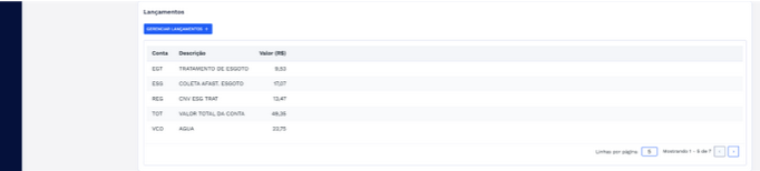 - Lançamentos: Lista as cobranças aplicadas à fatura, incluindo descrição dos serviços e valores correspondentes, além da opção para gerenciar lançamentos.