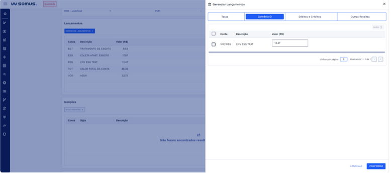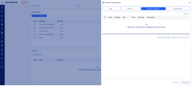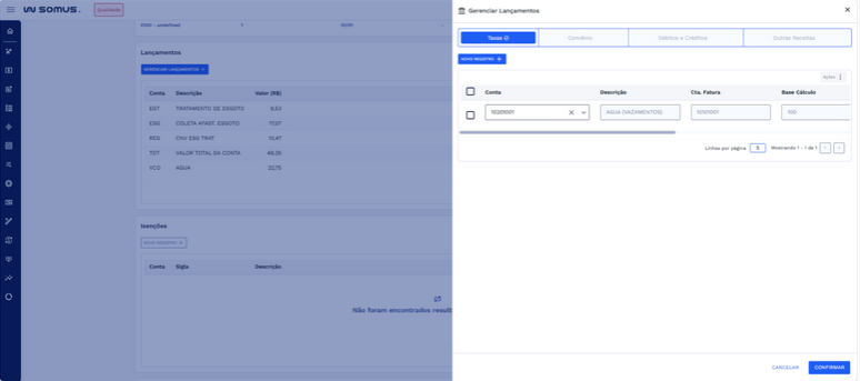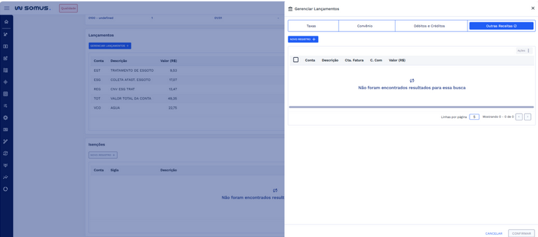 Lançamentos: Na seção de lançamentos, é possível visualizar e gerenciar os lançamentos com operações de inclusão e exclusão de taxas, convênio, consulta de débitos e créditos, bem como inclusão e exclusão de outras receitas.