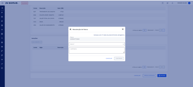 Confirmar: O sistema realizará o cálculo da fatura com base nos novos dados fornecidos. Uma vez concluído o processamento, você será redirecionado para a tela de manutenção, onde os dados de faturamento estarão atualizados de acordo com as alterações realizadas.