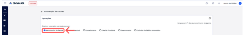 Ao acessar a tela do manutenção de faturas, selecione a opção “Manutenção de Faturas”.