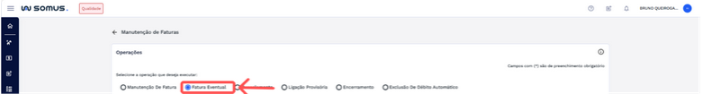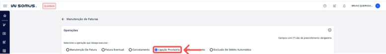 Ao acessar a tela do manutenção de faturas, selecione a opção “Ligação Provisória”.