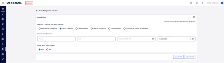 - Se a opção "Não" for selecionada, o sistema não utilizará a fatura como modelo. Nessa situação, o campo UC será removido dos critérios de execução, e os dados específicos da fatura serão apresentados em branco. Apenas as informações referentes à UC e ao cliente serão mantidas, exigindo que o usuário preencha manualmente os demais campos. Os dados apresentados na tela de manutenção de fatura são definidos conforme a rotina de configuração inicial, que determina as informações a serem recuperadas com base na UC e no mês de referência definidos previamente. Isso pode variar conforme a configuração da UC.