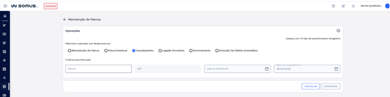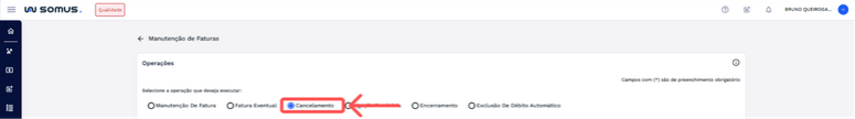 Ao acessar a tela do manutenção de faturas, selecione a opção “Cancelamento”.