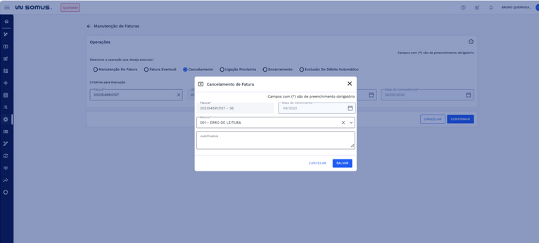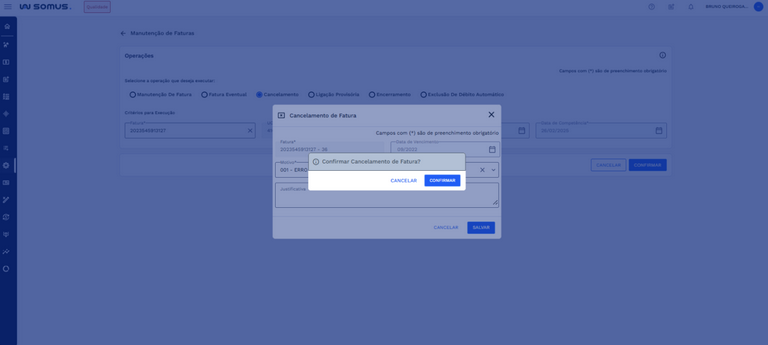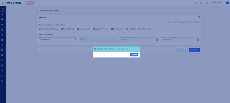 - Justificativa (campo opcional para detalhar o motivo do cancelamento da fatura).