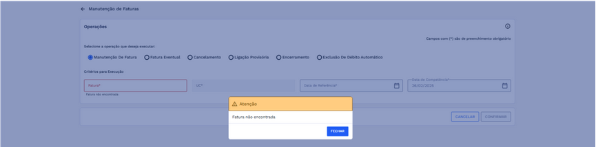 - Fatura: Digite o número da fatura que deseja executar a ação. Caso a fatura não seja localizada, o sistema exibirá a mensagem de erro "Fatura não encontrada" e os campos subsequentes não serão preenchidos.