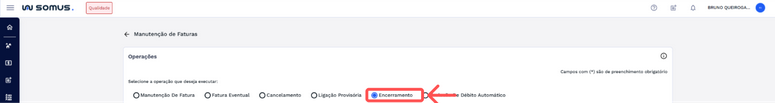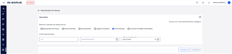 Ao acessar a tela da manutenção de faturas, selecione a opção “Encerramento”.