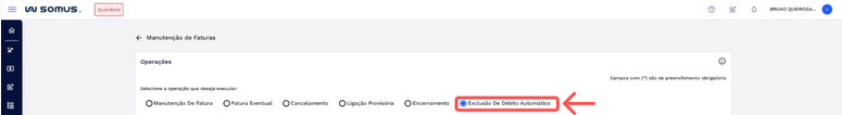 Ao acessar a tela do manutenção de faturas, selecione a opção “Exclusão de Débito Automático”.