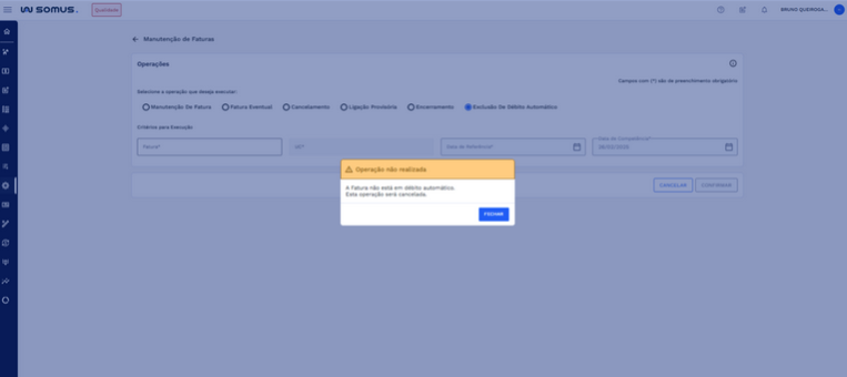 - Não: A fatura não será incluída no débito automático, e o sistema redirecionará para a tela de manutenção de fatura.