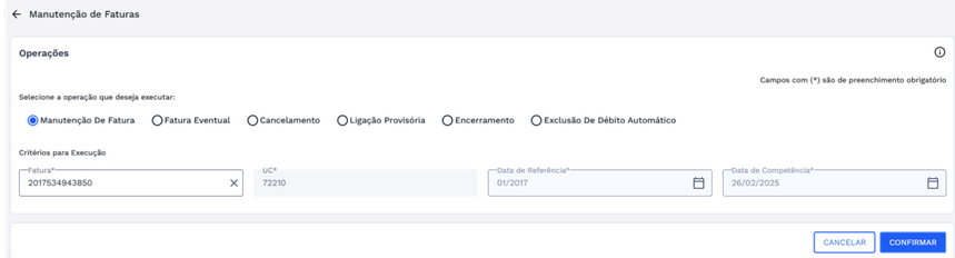 - Fatura: Digite o número da fatura que deseja executar a ação. Caso a fatura seja localizada, os campos UC, Data de Referência serão preenchidos automaticamente com as informações correspondentes.
