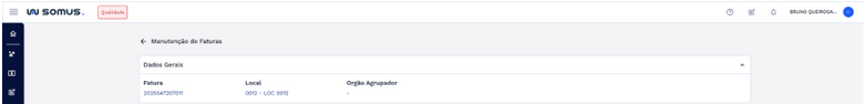 - Dados Gerais: Exibe informações principais da fatura, como o número da fatura, local e órgão agrupador.