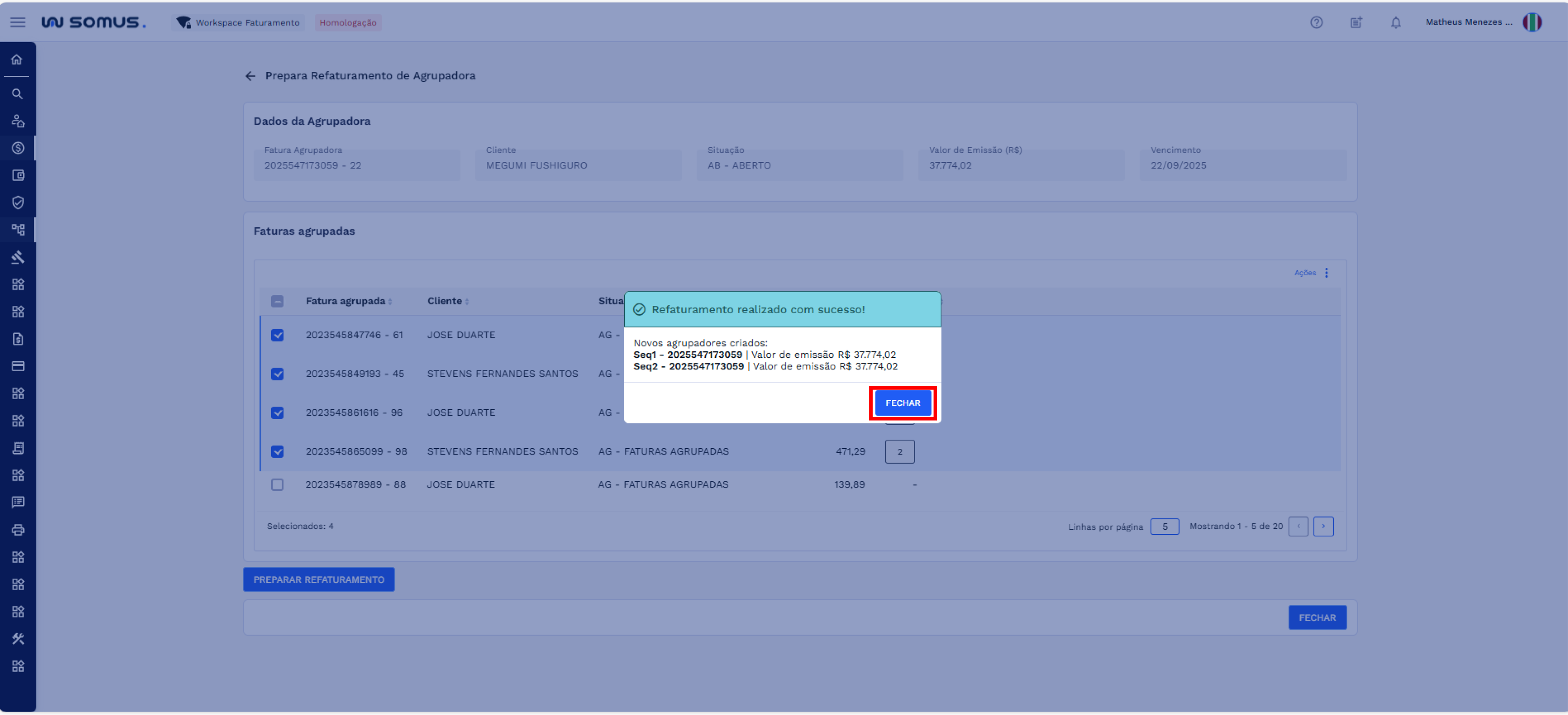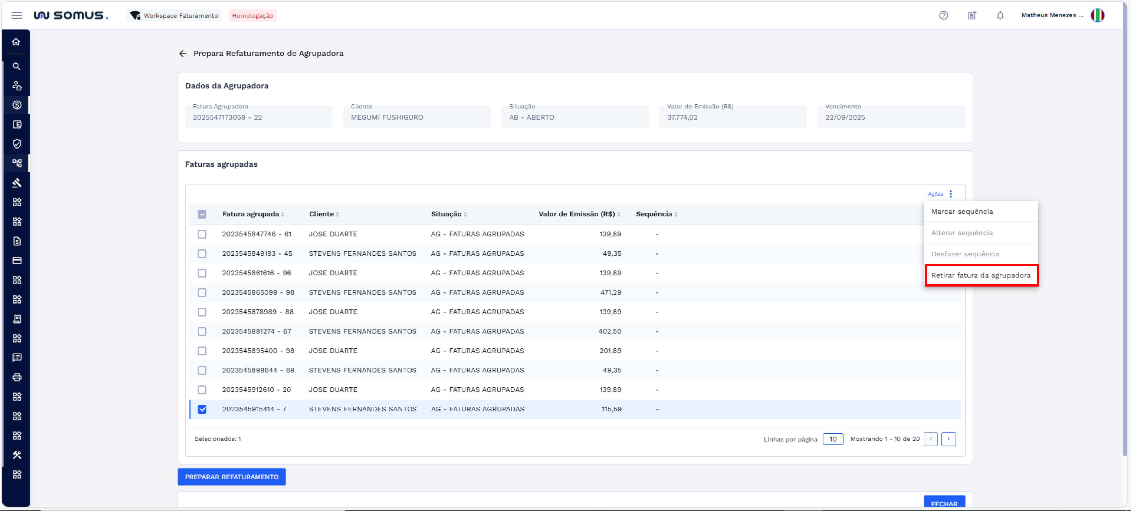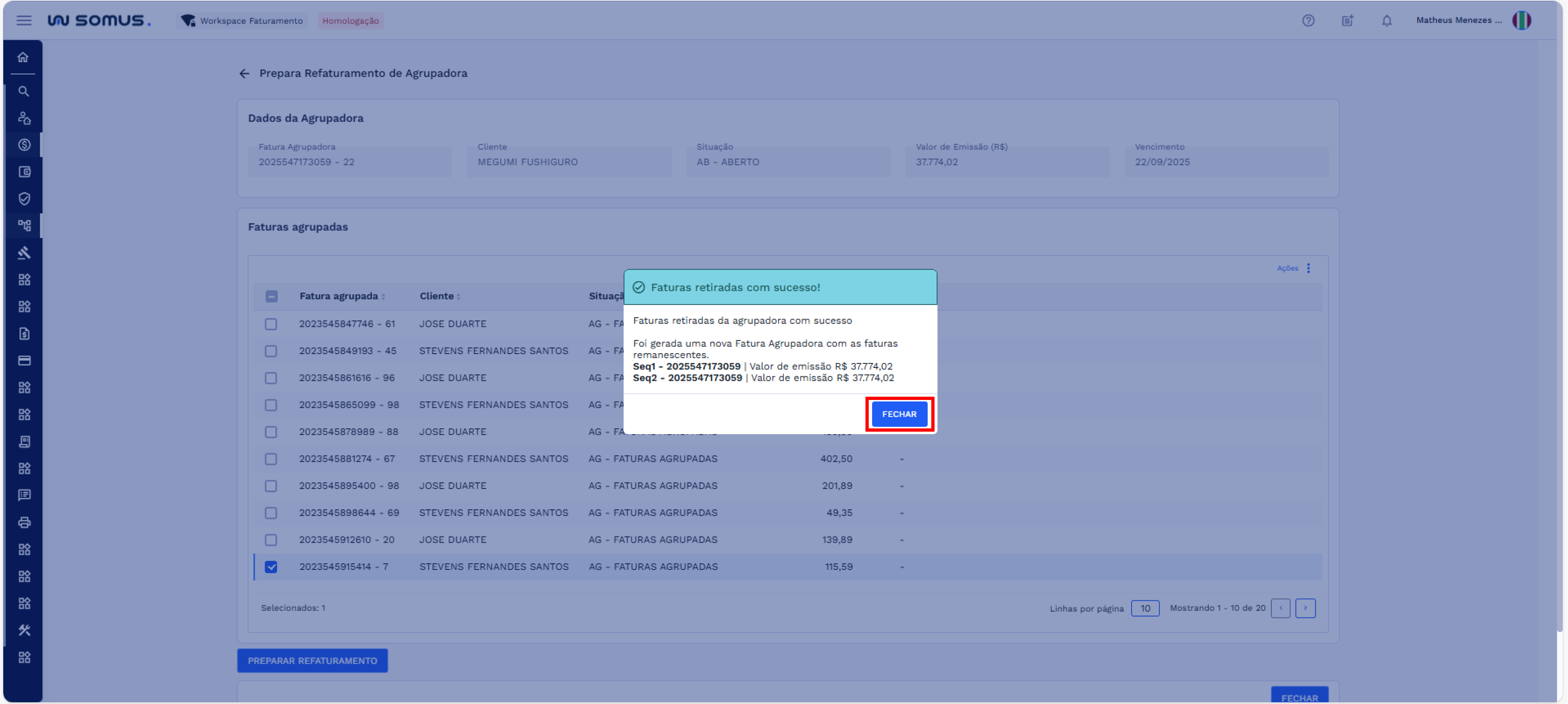 - Faturas não selecionadas permanecem na fatura agrupadora atual.