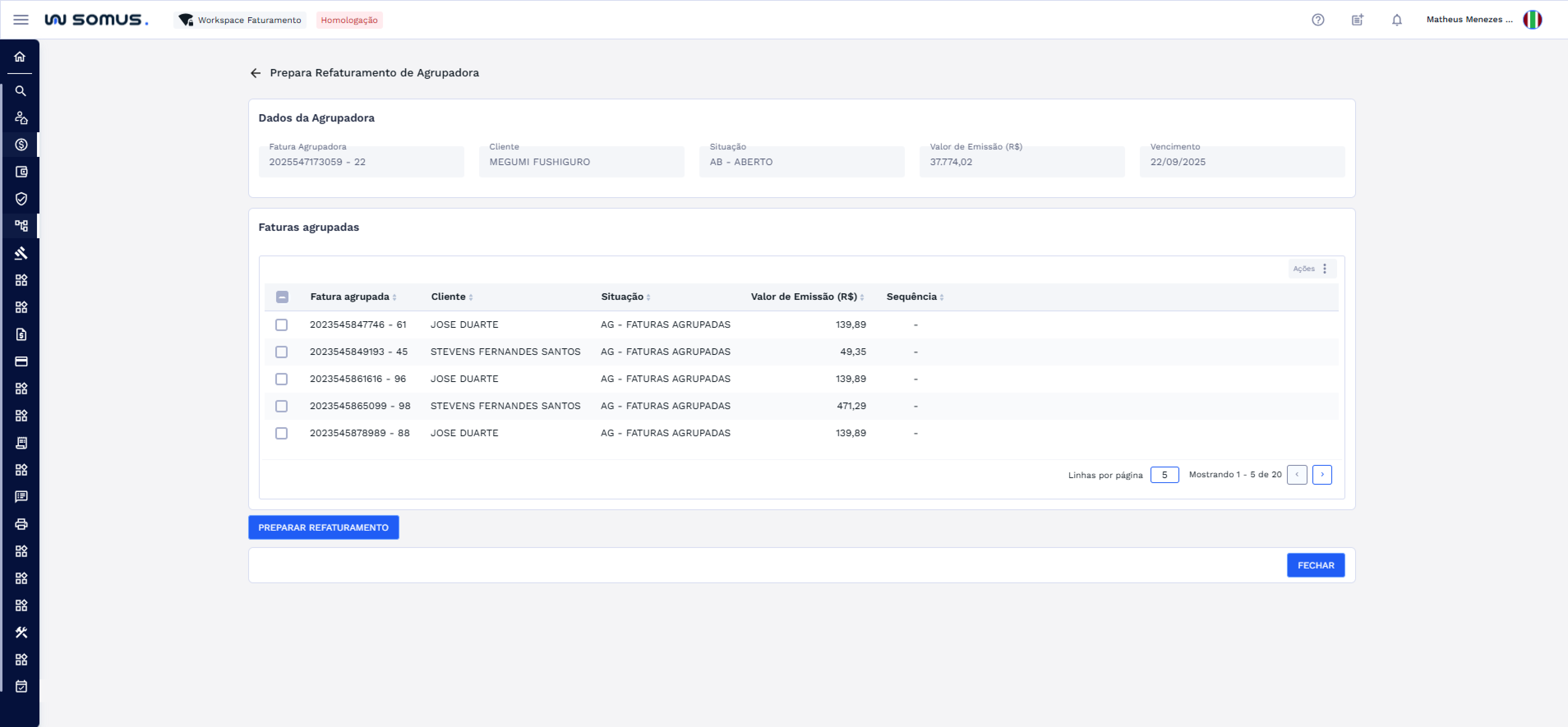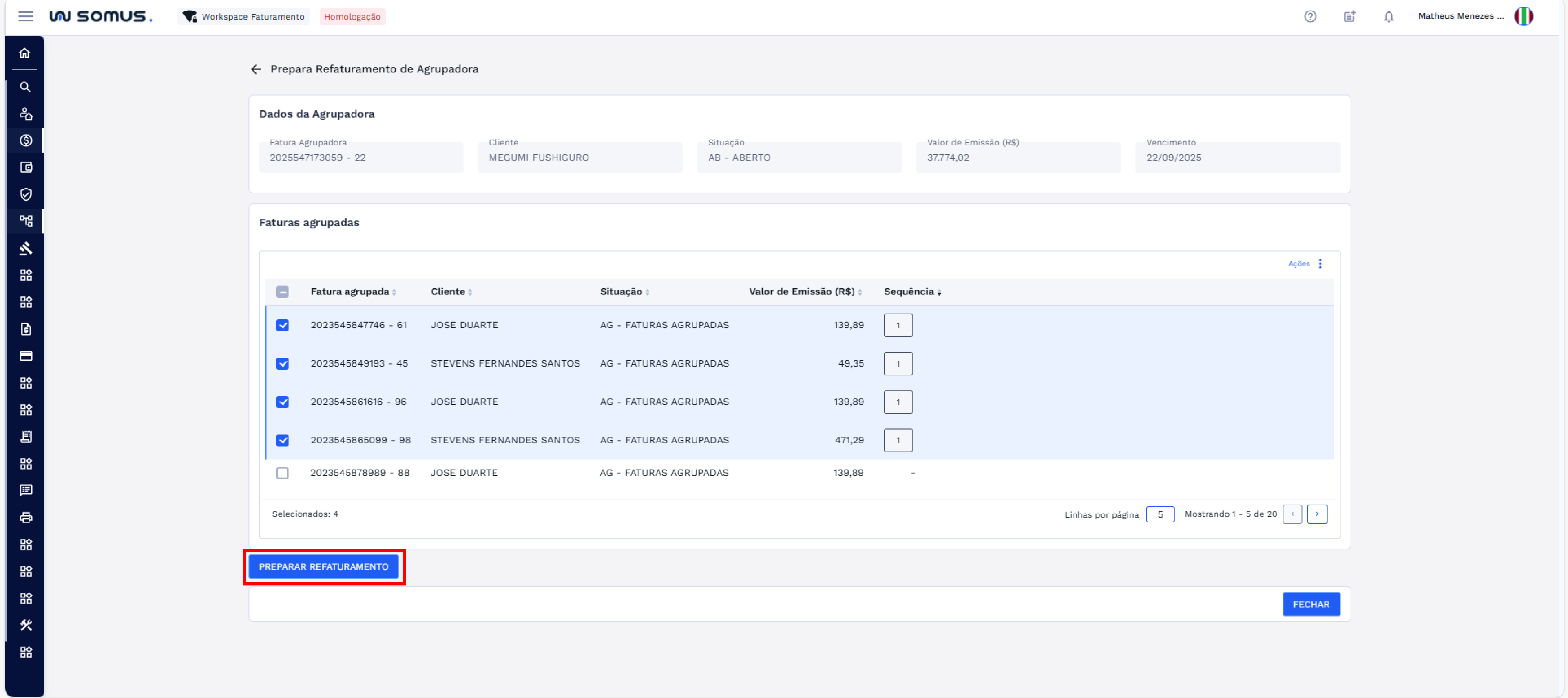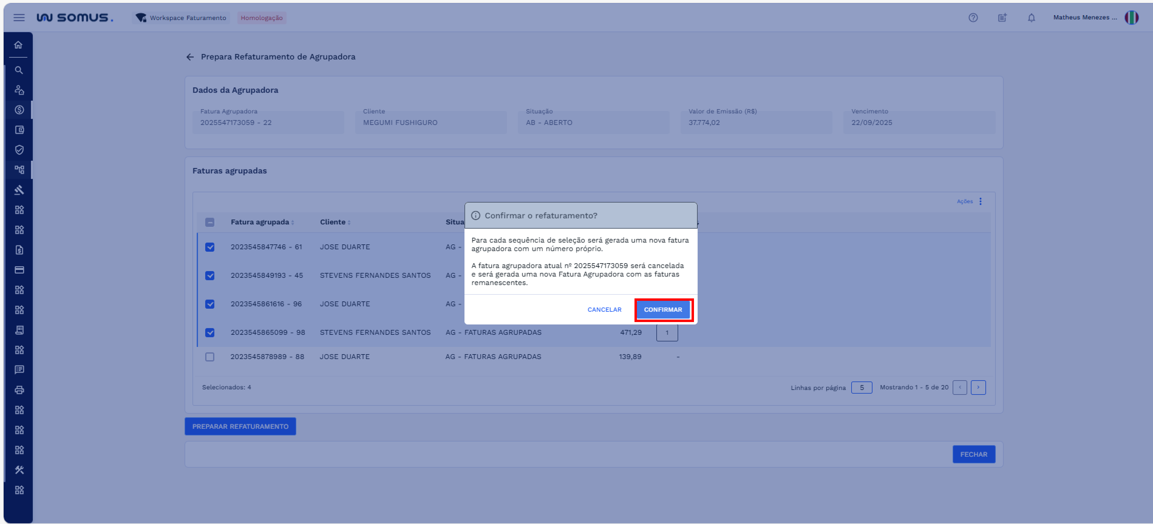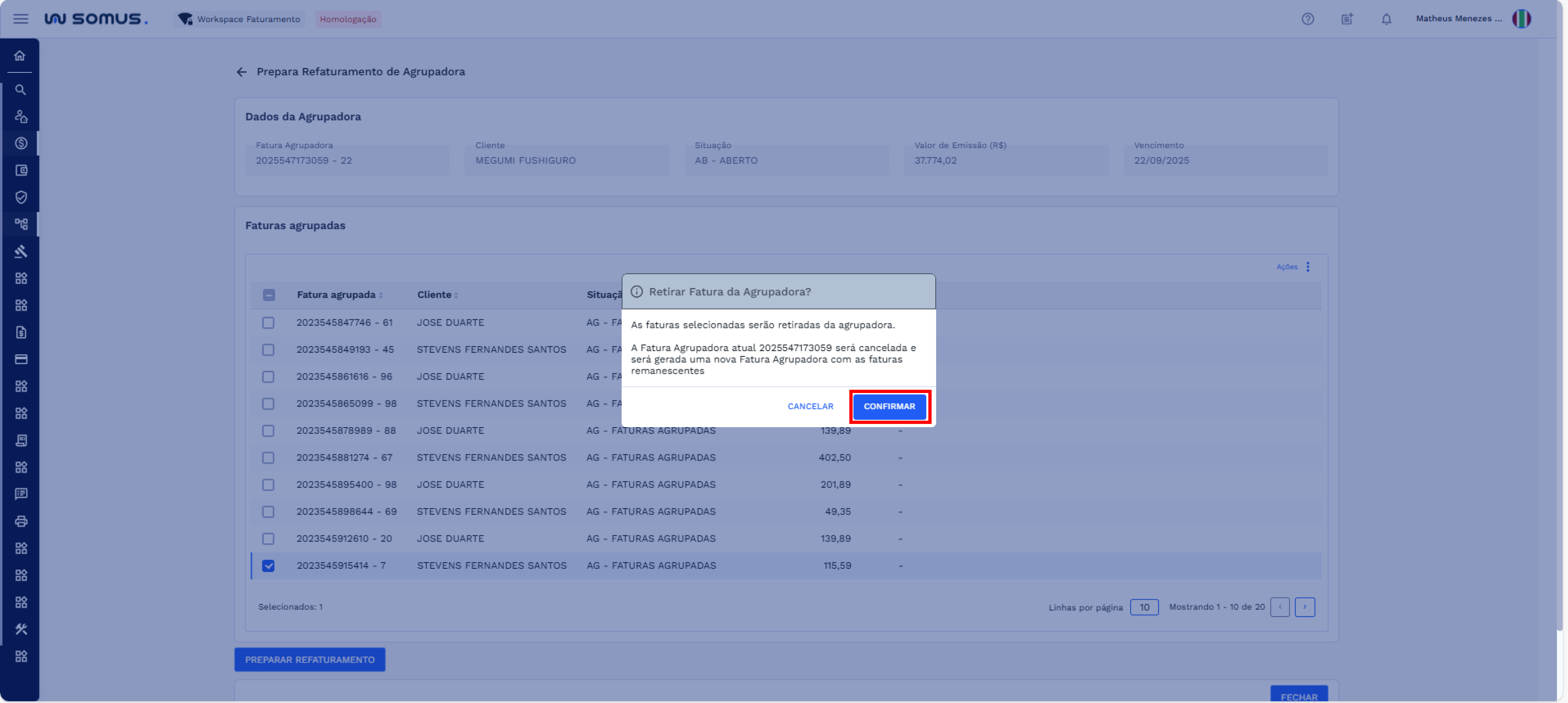 - Faturas não selecionadas permanecem na fatura agrupadora atual.