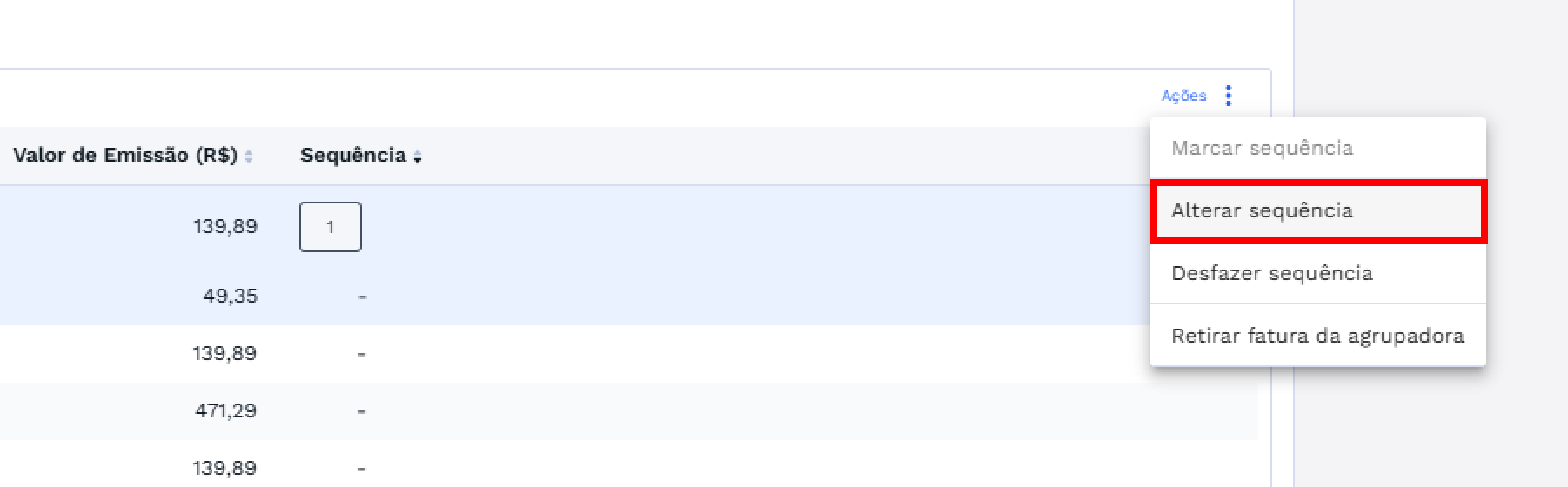 Se apenas uma fatura estiver selecionada e ela não tiver sequência marcada, a opção “Alterar Sequência” estará desabilitada.
