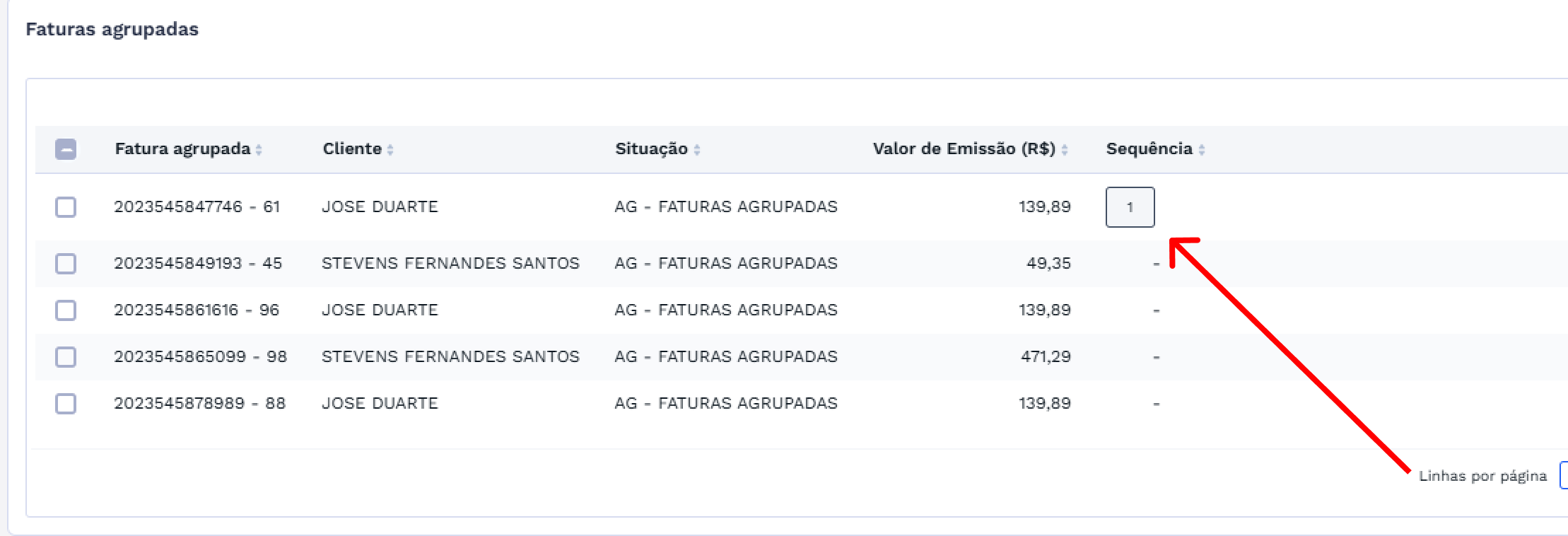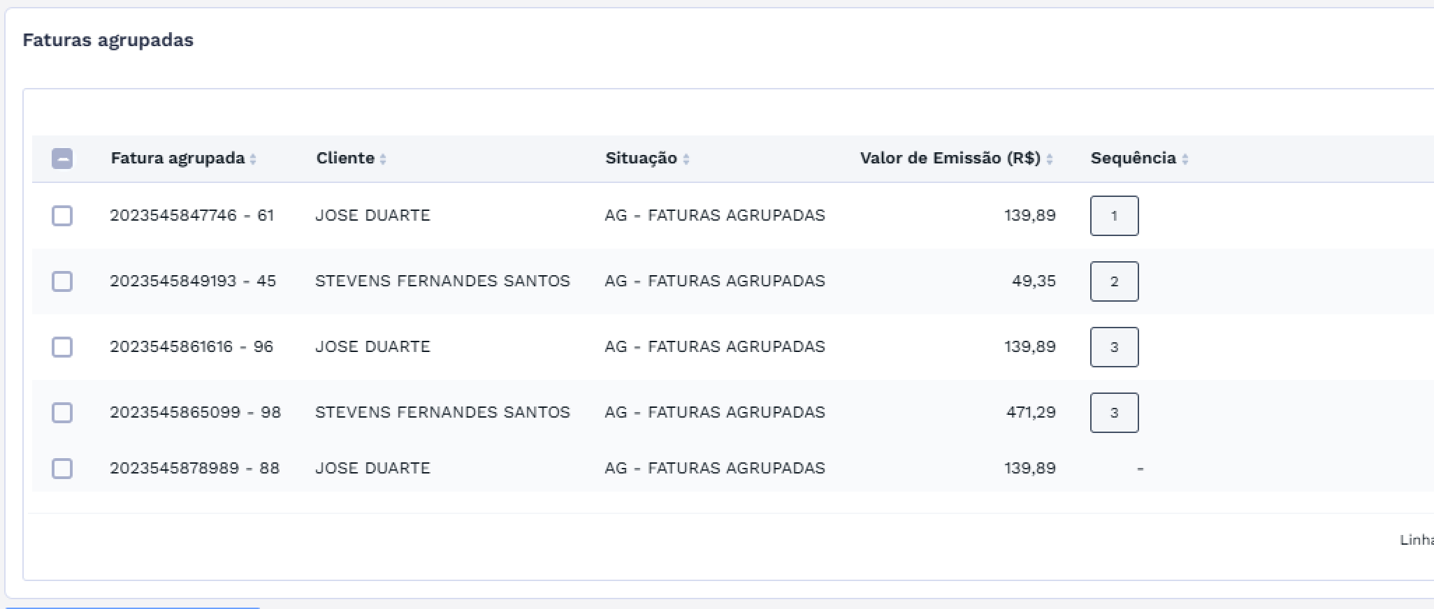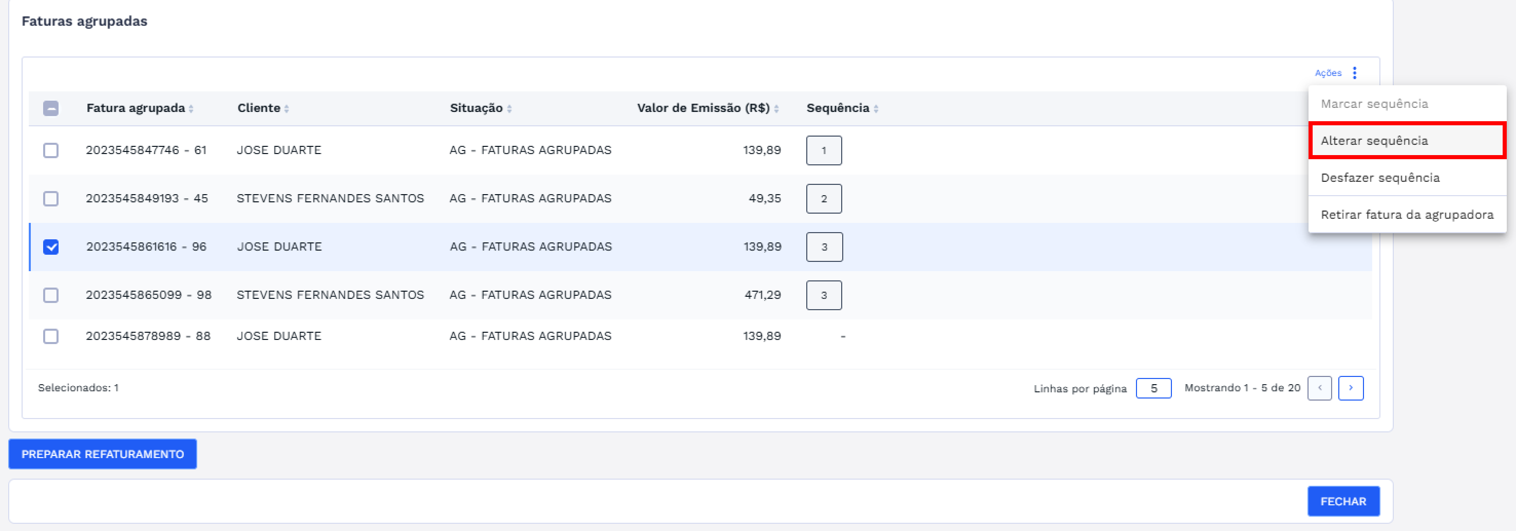 Para alterar a sequência de uma ou mais faturas agrupadas, selecione na lista os itens que deseja modificar.