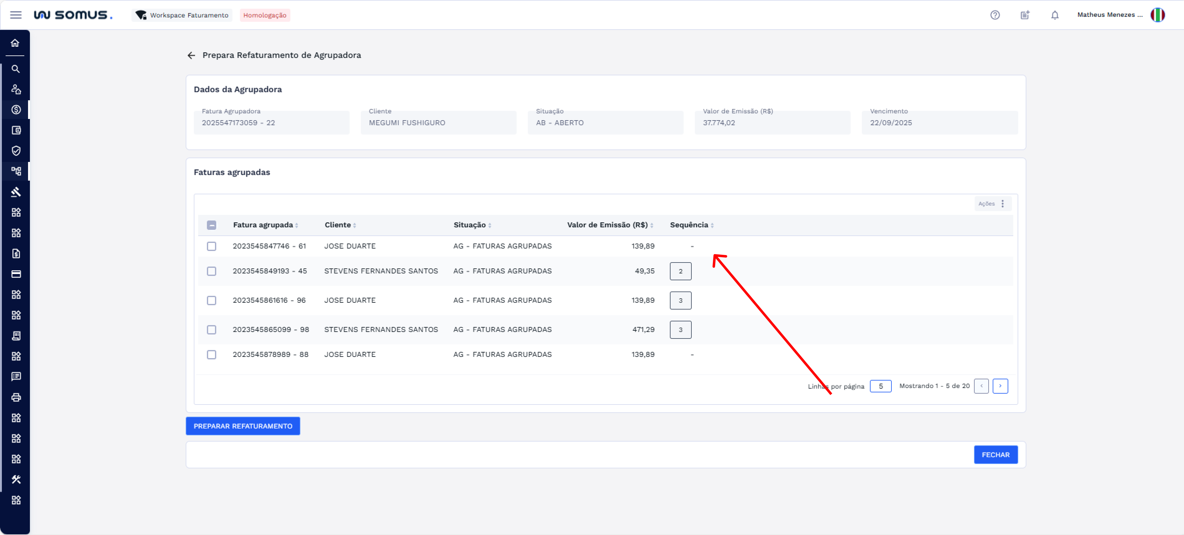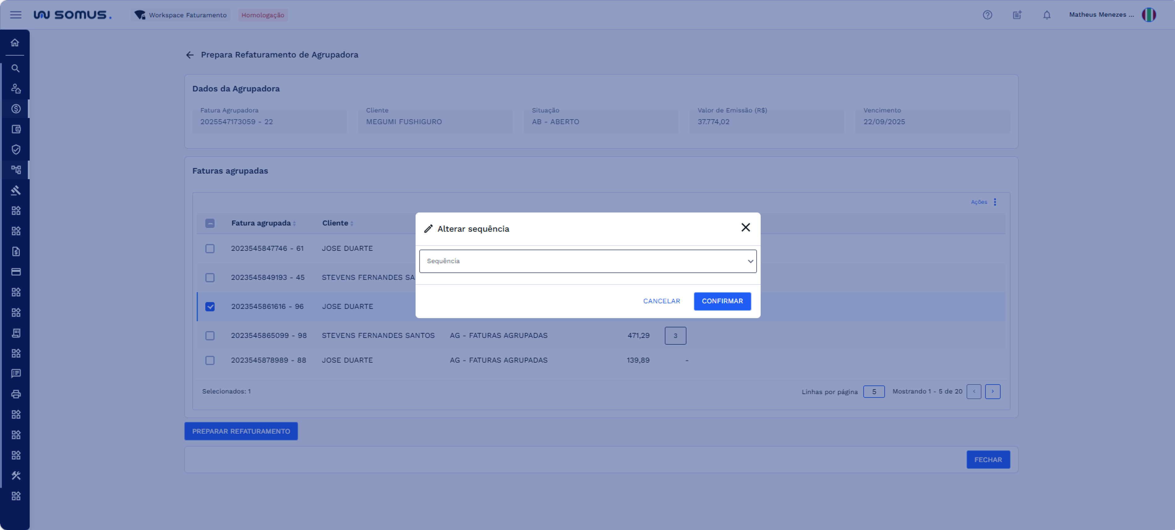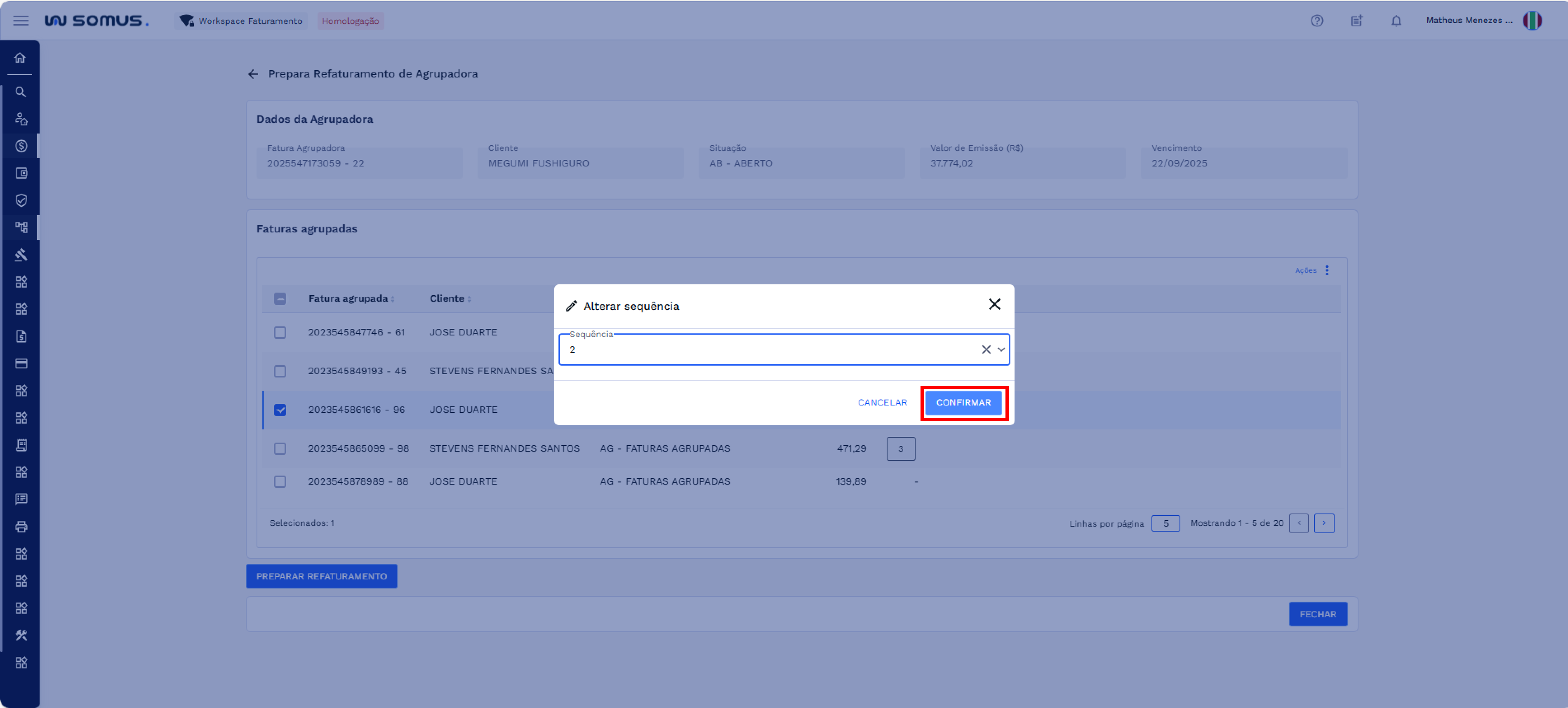 Para alterar a sequência de uma ou mais faturas agrupadas, selecione na lista os itens que deseja modificar.