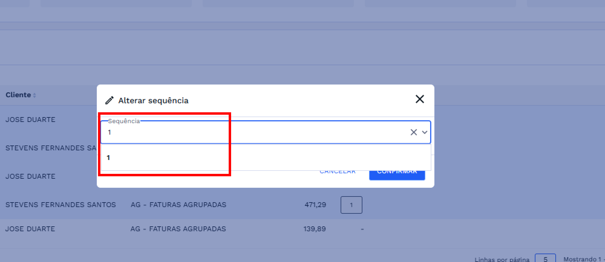 - Quando apenas uma fatura for selecionada, ou quando várias faturas forem selecionadas e todas possuírem a mesma sequência, a modal exibirá o valor atual da sequência.