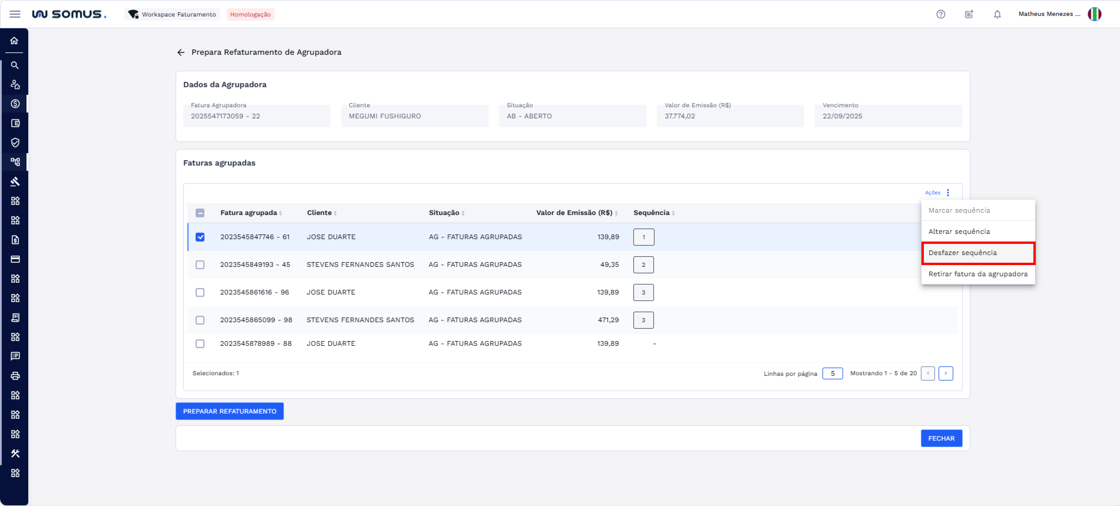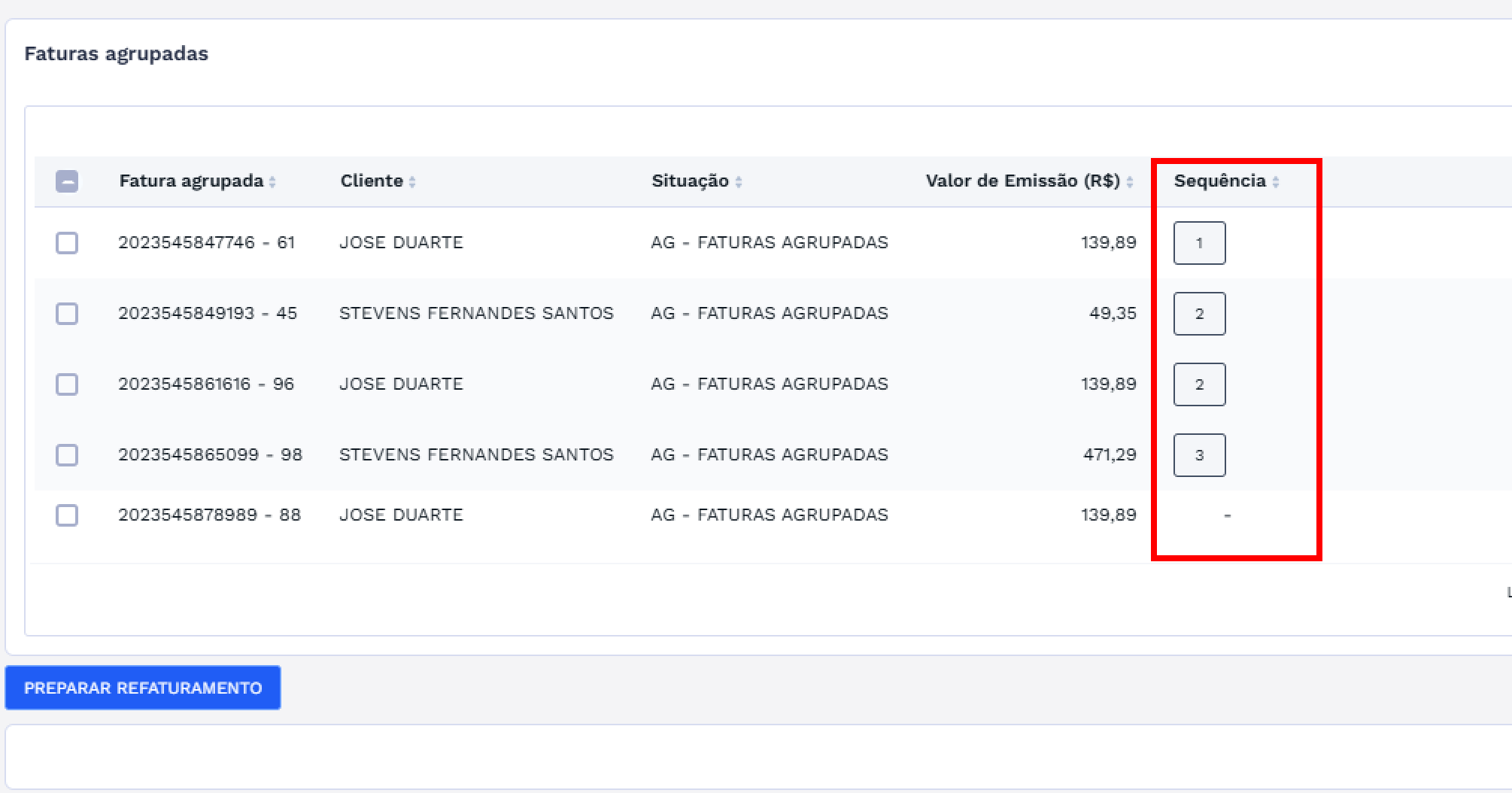 Selecionando faturas que já possuam sequência marcada, o usuário pode desfazer a marcação. Esta funcionalidade facilita a correção da lista antes de preparar o refaturamento.